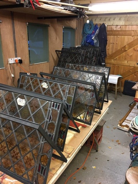 Metal windows often require removal and restoration off-site and we typically temporary-glaze rather than fit unsightly boarding . The leaded panels are rebuilt with new matching lead cames retaining old glass whenever possible. Any cracks can be repaired by leading or coppering but if replacement glass is needed a modern antique matched closely to the original is employed .